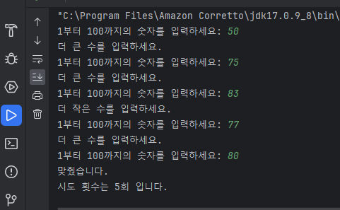 💡 random() 메서드를 이용해서 1~100 사이의 숫자를 하나 만든다. 반복문 안에서 해당 숫자를 맞출 때까지 계속 숫자를 입력받도록 하고, 숫자를 맞추면 종료하고 몇 번만에 맞췄는지를 출력해주는 프로그램을 작성하라.