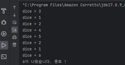 💡 random() 메서드를 이용해서 1~6이 나오는 주사위를 설정하고 주사위가 계속 던져지면서 6이 나오면 종료되는 코드를 작성하라.