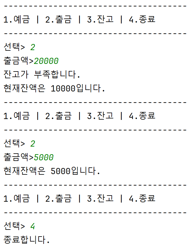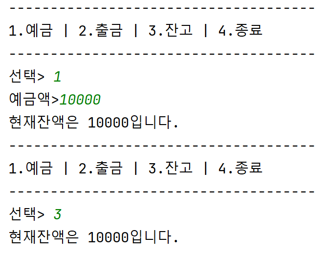 System.out.println("1.예금 | 2.출금 | 3.잔고 | 4.종료");